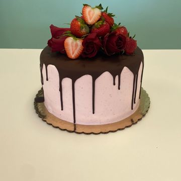 8 in 2-layer strawberry cake filled with vanilla buttercream, topped with fresh strawberries and a birthday message of choice.