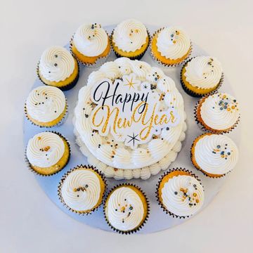 6 in custom tall buttercream cake and 1 dozen matching cupcakes.